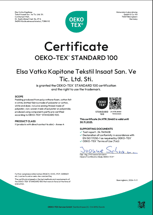 Elsa Vatka ürünleri, OEKO-TEX® Standard 100 sertifikalı üretim tesislerinde hazırlanır. Sağlıklı, çevre dostu ve güvenilir üretim garantisi sunar. Kalite, güvenlik ve sürdürülebilirlik Elsa Vatka’nın üretim anlayışının temelidir.Tüm ürünlerimiz OEKO-TEX® Standard 100 sertifikalı olup, insan sağlığına zararlı hiçbir madde içermez.Her üretim hattında yapılan testler, kalite belgesi, ürün uygunluk sertifikası ve test raporlarıyla belgelenir.